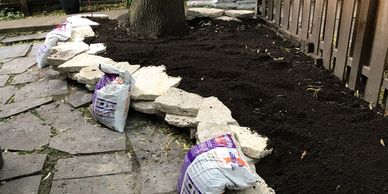 We brought in a locally-sourced rock boarder to add height, boost soil holding capacity and add more plant dimension to the landscape. Not to mention, to solve that pesky flooding issue by boosting water absorption across the entire perimeter of the garden pathway.